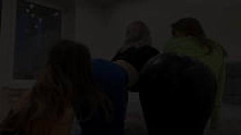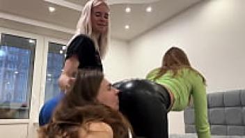 Double Facesitting Femdom With Mistresses Kira and Sofi in Spandex and Nylon