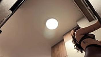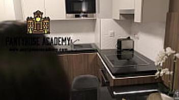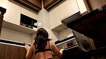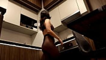 In the kitchen, a gorgeous, seductive, petite blonde wearing shiny black pantyhose without underwear
