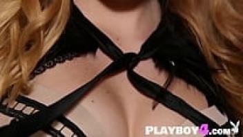 After a seductive striptease, gorgeous busty model Harley Rae flashes her adorable pussy.