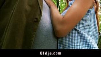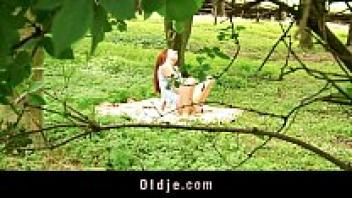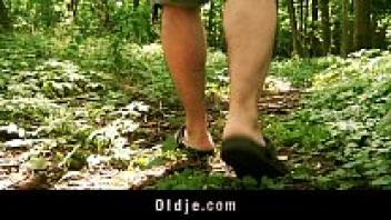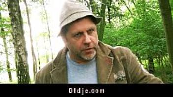 Strange elderly woodland man who adores a redhead in the woods