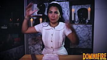 Agnes, the rubber nurse, is trying on her brand new blue latex nurse dress for the first time. The test subject has his colon cunt crammed to the elbows, and his cock is successfully milked off.