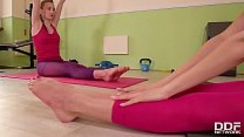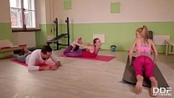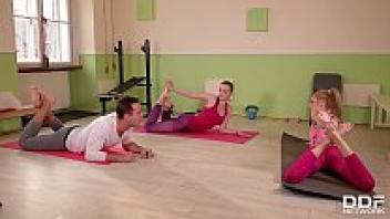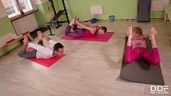 Monique Woods and Chelsy Sun, two yoga chicks, share Brit's bigger dick at the gym.