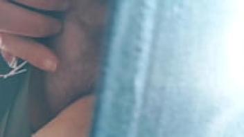 An Asian schoolgirl has an orgasm while masturbating her hairy, wet pussy upskirt.