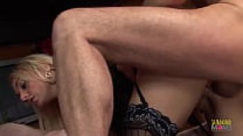 A stunning older woman wearing sultry black underwear is sitting on her boss's desk with two large cocks.