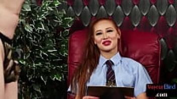 A red-haired CFNM voyeur in a corporate uniform observes a guy wanking.