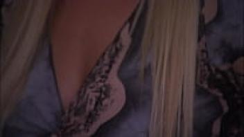 A thick, hard dick is placed between the large, false breasts of a cock-loving blonde milf.