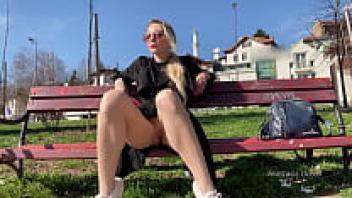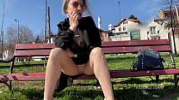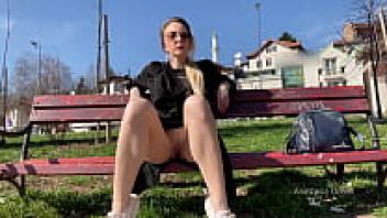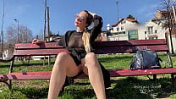 relaxing at a park while showing off your pussy to passersby. In public, keep your legs open.