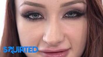 Violet Monroe, a naked redhead babe, was squirted by two large cocks in an FMM threesome.