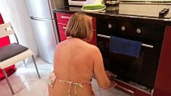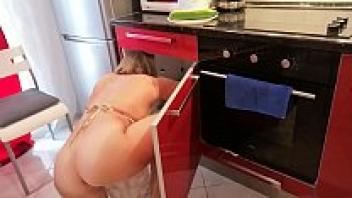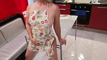 The blonde loves herself with various utensils and gets excited in the kitchen.