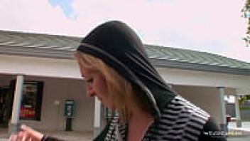Outside, a blonde beauty with little tits is being loved and fingered.