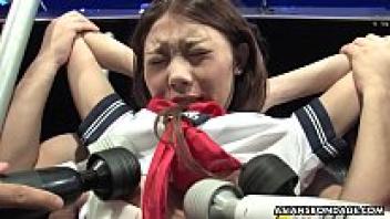 Mika Shindo, an Asian bondage brunette, with a group of men.
