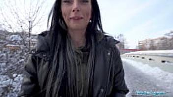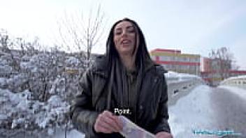 In public, Public Agent Blue-Eyed Babe sucks a massive, fat dick in the snow.
