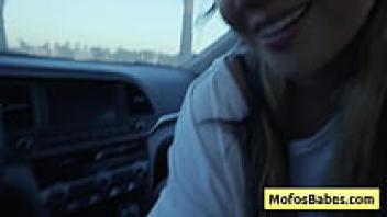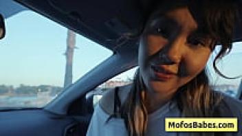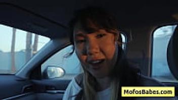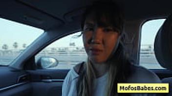 In front of her buddy, a gorgeous Asian woman plays with her naturally large breasts in the automobile (Tomie Tang, Charles Dera).