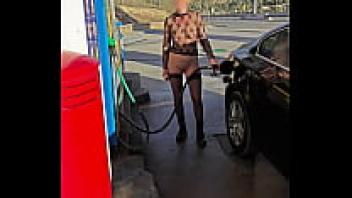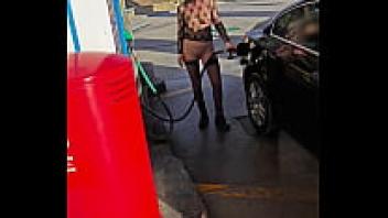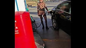 At a gas station, flashing