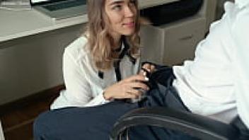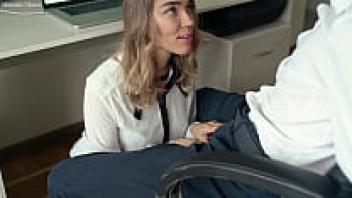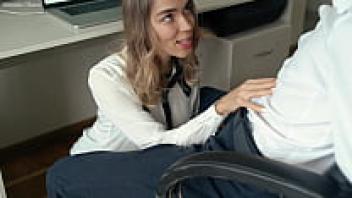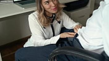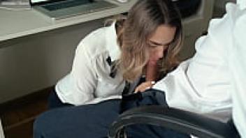In the office, the attractive secretary gives the boss a blowjob and swallows all the cum from the hard, pulsating cock.