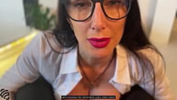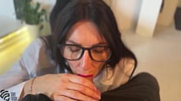 The son of a German stepmother with large tits gives her a cum-on-face facial while wearing glasses.