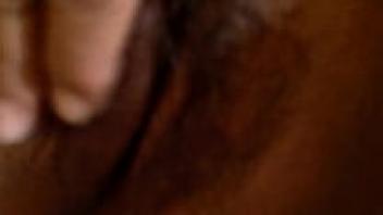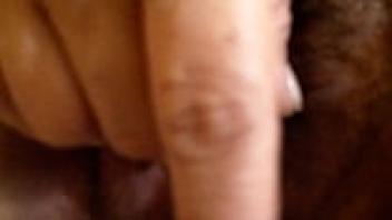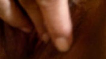 Close-up of an erect clitoris and wet vagina. A chubby milf masturbates her hairy pussy while wearing nylon pantyhose. homemade fetish.