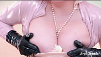 Arya Grander wears a latex catsuit and performs a strap-on suck and facesitting in the FemDom video.