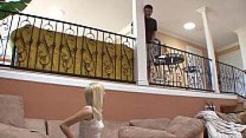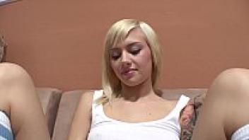 Emma Mae, a young blonde lady with shaved pussy, was drilled on the couch.