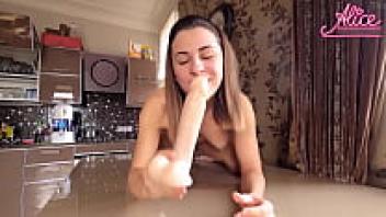 Hot Solo Brunette in Lingerie Sucking Big Dildo Closeup