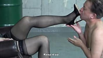 Foot fetish. The domineering Mistress's feet are kissed and licked by the slave. The slave spit in his mouth.
