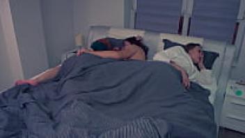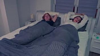 One lucky guy in a wild foursome (step-sister, step-mother, and girlfriend) shared a bed!