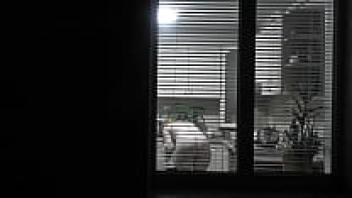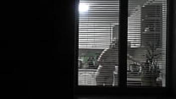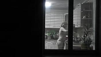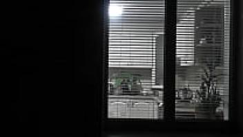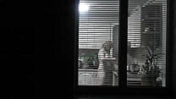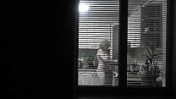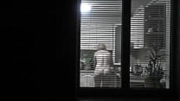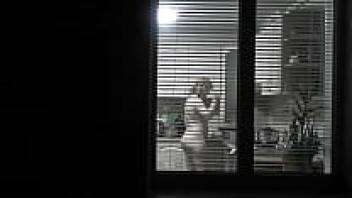 observing. Voyeur. In the evening, a pervert voyeur on the street watches out the window while her lovely, nude neighbor in the kitchen makes supper for her husband. Publicly nude. At home, naked. Family. Outside