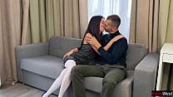 On a chair, hard-loving a girl wearing white pantyhose