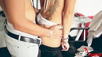 In the automobile, two attractive blonde bitches are pursuing a man with a large, firm dick for love.