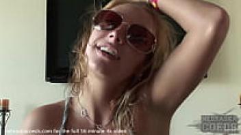 Amelia Miller, a blonde spinner, stripteases and loves Dildo.