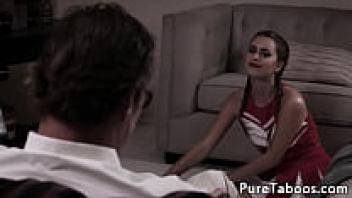 Stepdad's legs are spread by a sexy cheerleader.