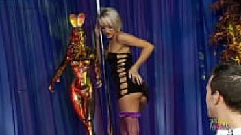 At a club, a large dicked guy is picking on a skinny, tattooed, blonde woman with short hair. She is getting a lot of attention.
