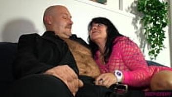 A plump, attractive woman in pink fishnet is in love with a lusty, hairy man.