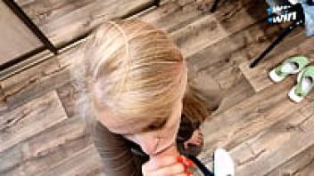 licking this blonde girl's foot while she smokes a cigarette before riding his dick until he cums in his pussy