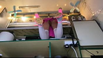 To get a better glimpse of Alice's pussy upskirt, the boss spreads her legs out.