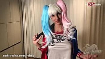 Lia Leone, a curvaceous beauty, is cosplaying a mischievous young Harley Quinn.