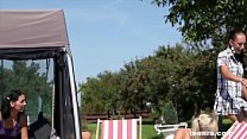 Gangbang in a parking lot with a curvaceous brunette