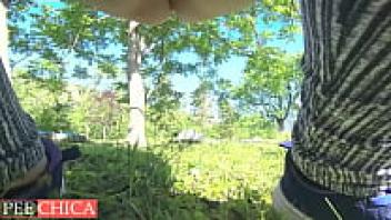 Chubby babe pissing in the garden during a thunderstorm wearing a wet shirt.