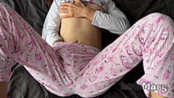Close-up of a large squirt Asian adolescent in pyjamas masturbating with a shaved pussy