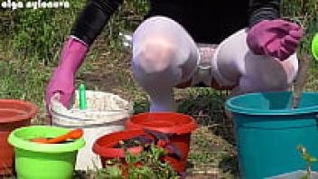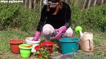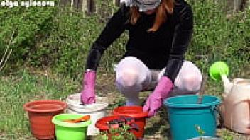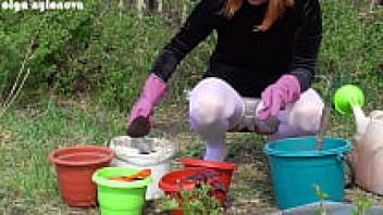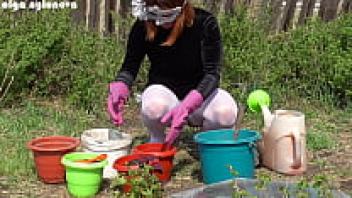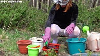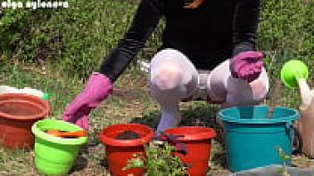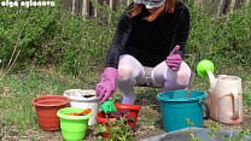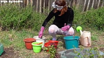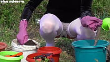 My girlfriend's upskirt during the flower-planting