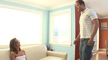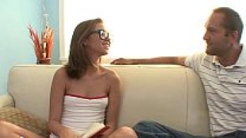 Sasha, a beautiful redhead adolescent, eats cock and then gets smacked over the sofa.