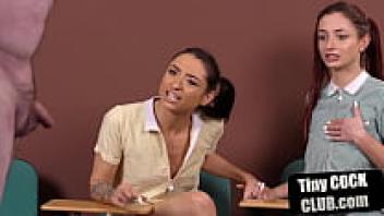 Micro penis dominas in the classroom making fun of a pitiful little cock