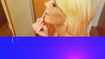 Playing with her pussy on a public hotel balcony, a blonde big-tit babe