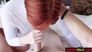 Redhead in clothes takes cum