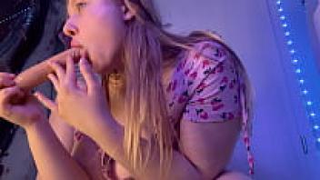 Hot Solo Brunette in Lingerie Sucking Big Dildo Closeup