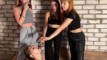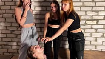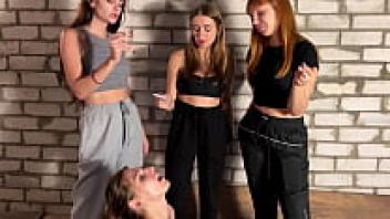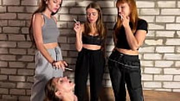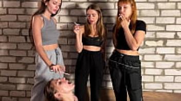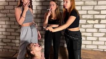 For three smoking girls, the slave's mouth serves as an ashtray.