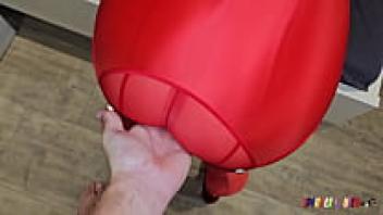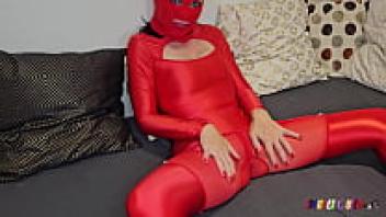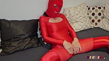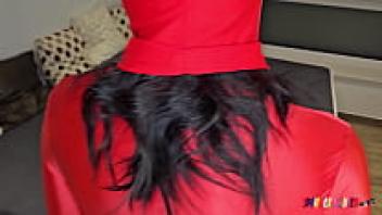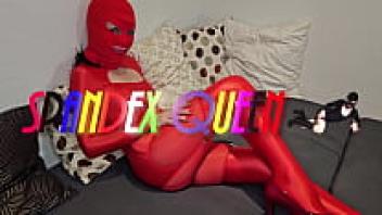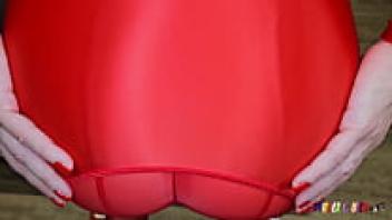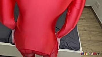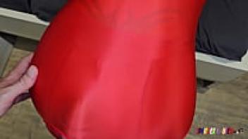 SpandexQueen makes him cum on her red spandex nylon leggings after sucking his dick twice.