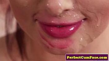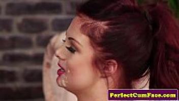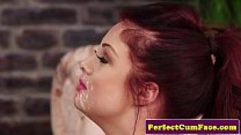 Spraying brunette and pink-haired British people with sperm