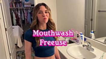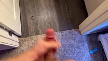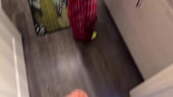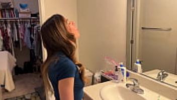 In the bathroom, the lustful, nude wife sucks her husband's dick while blowing hard and spitting a lot of cum in her mouth.