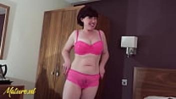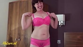 Janey, a gorgeous British cougar, is pulling a vibrator up her hairy pussy.